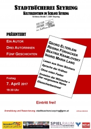 Auf Grund des zu erwartenden Interesses und der begrenzten Anzahl an Sitzplätzen ersuchen wir um unbedingte und rechtzeitige Platzreservierung unter: Mobil: 0699 88 784092 oder E-Mail: stadtbuecherei.seyring@gmx.at